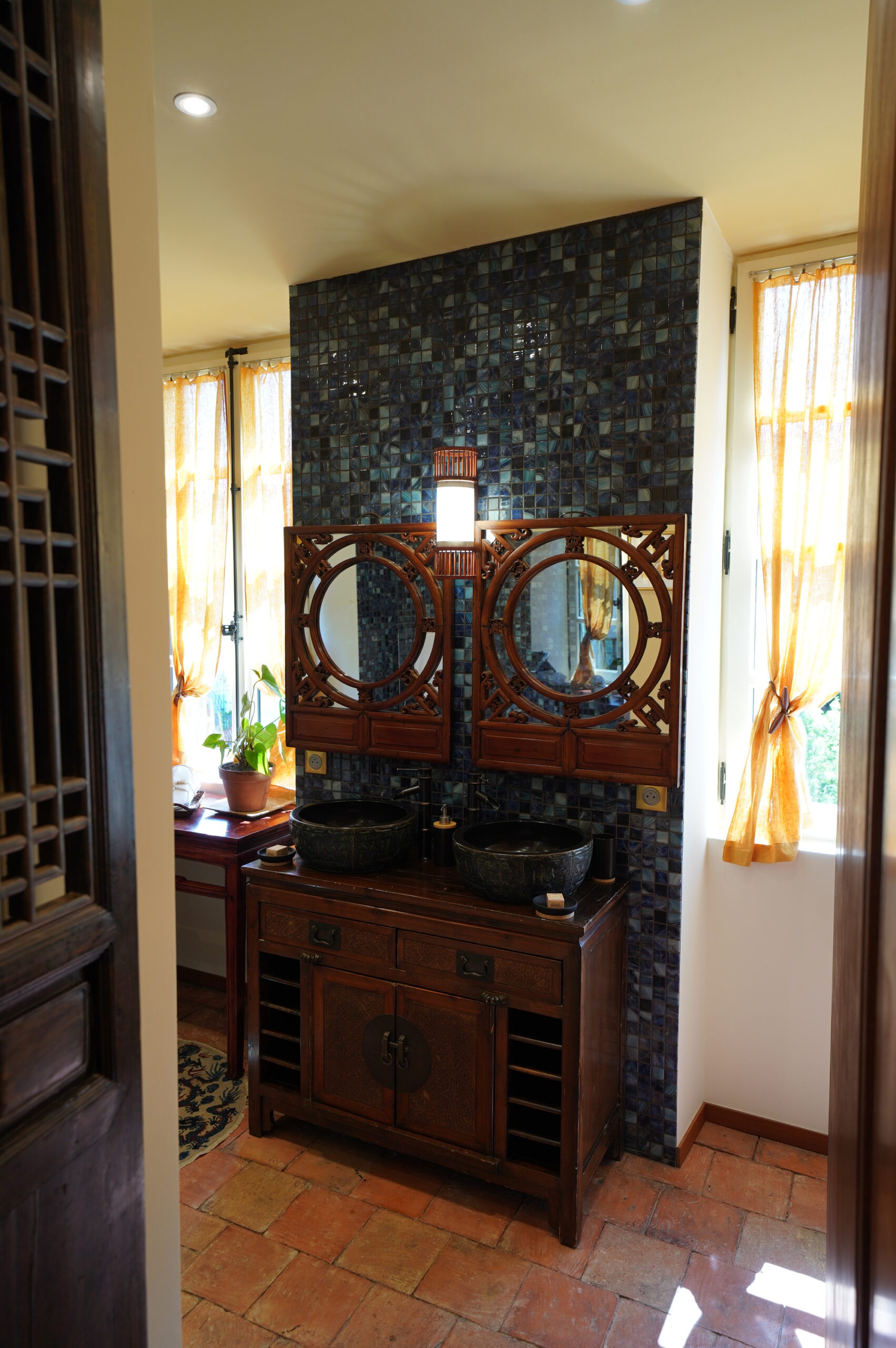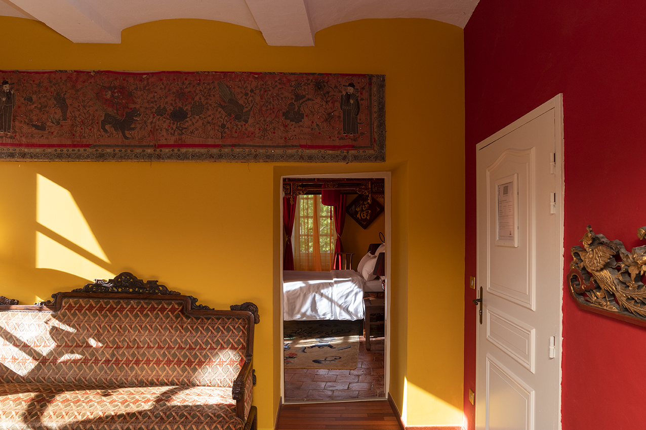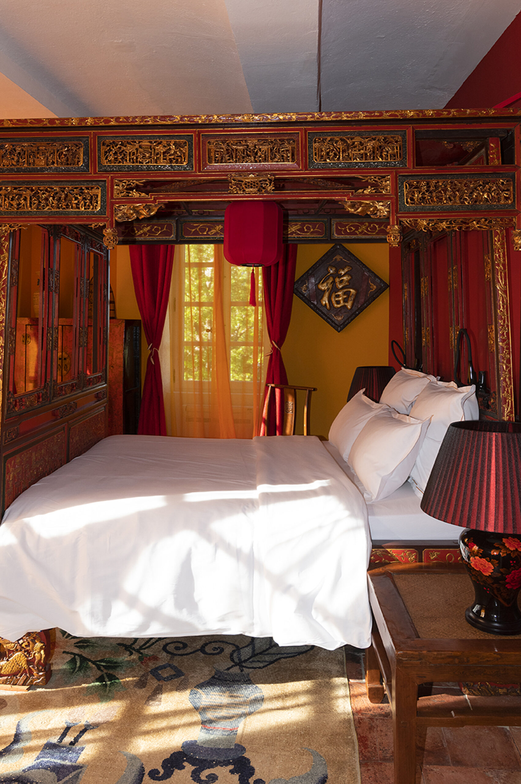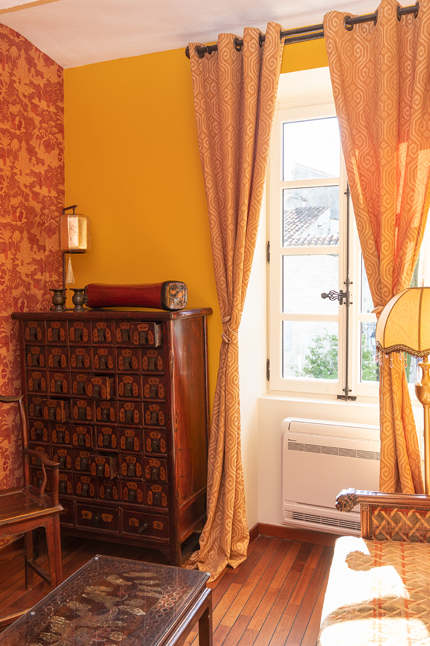 Exposition est et sud par 3 fenêtres avec vue sur la place de la fontaine et le Château de Barjac. Sol en tommettes anciennes, lit chinois de fumeur d’opium, mobilier chinois 18ème et 19ème siècle. Lit en 160.