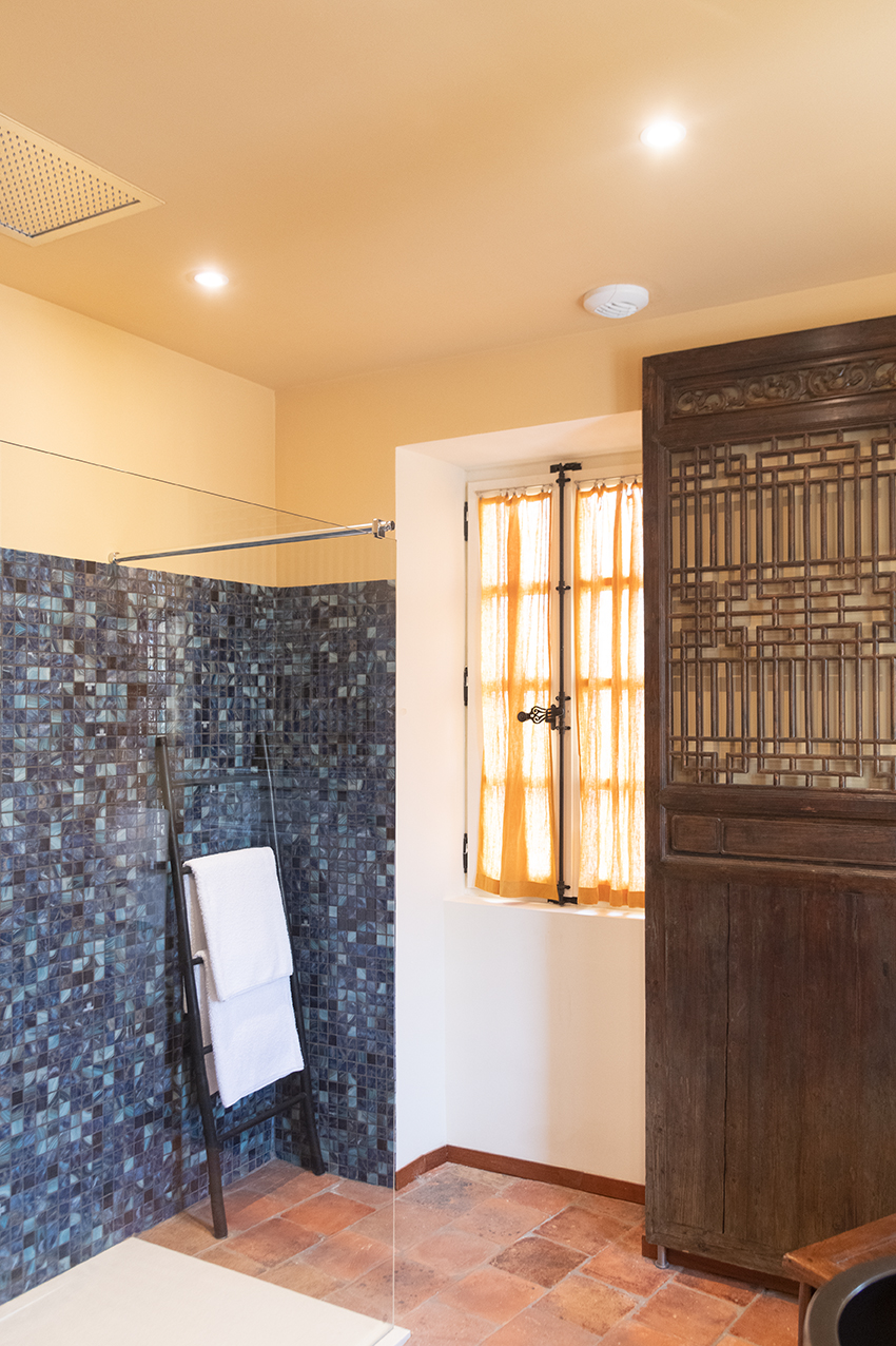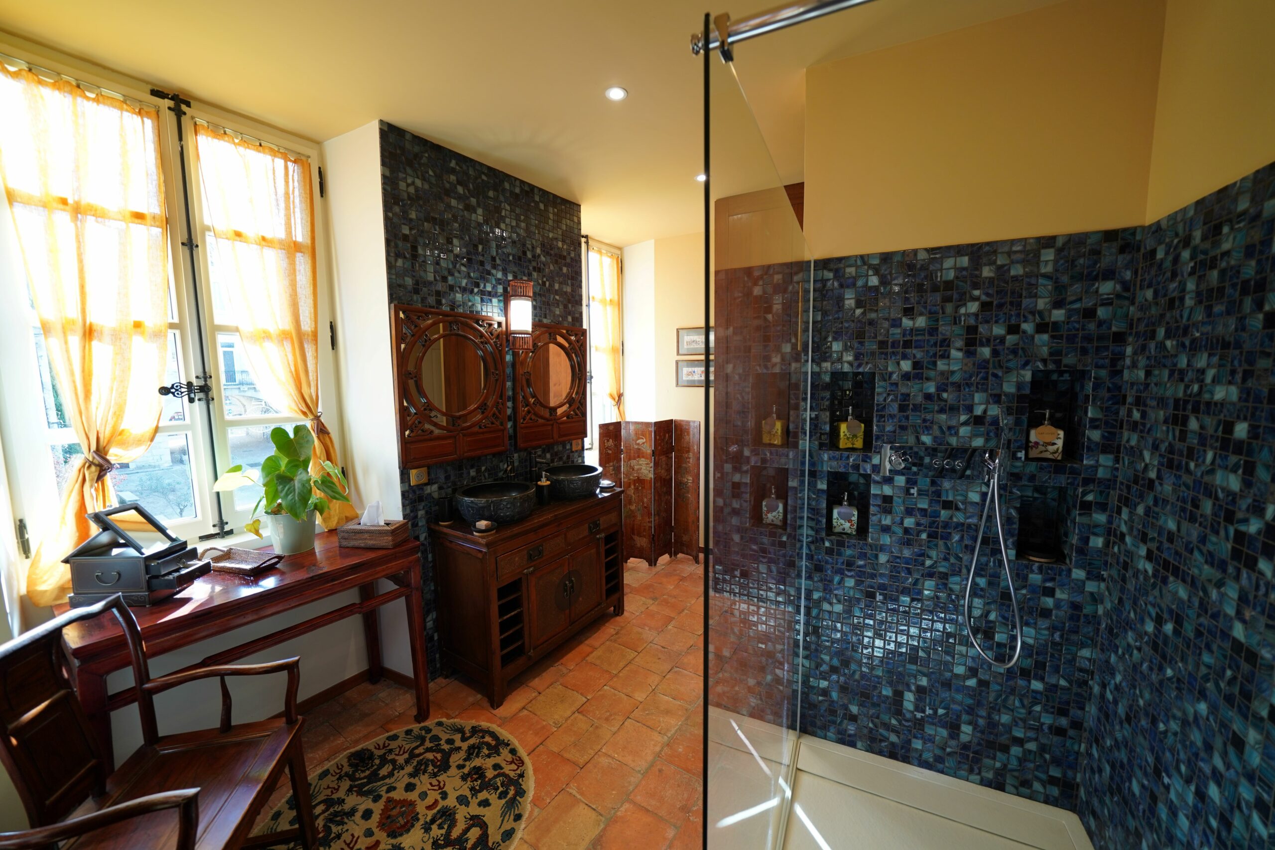 Exposition nord et est par 3 fenêtres avec vue sur le jardin et la place de la fontaine. Sol en tommettes anciennes, douche à l’italienne (100 X 140) à effet de pluie tropicale, 2 lavabos, dressing. Produits d’accueil. Toilettes séparées.